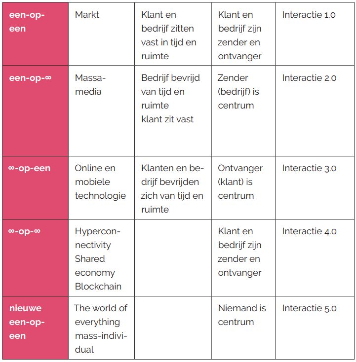 Bedrijven staan nu voor de grote uitdaging, zo schrijft Vera, om de nieuwe een-op-een (5.0) waar te maken terwijl ze de onderliggende interacties ook nog moeten beheersen. De kracht van het netwerk veel-op-veel faciliteren (4.0), de klant tot centrum van zijn wereld maken en weten dat die zich niets laat opdringen (3.0), zich – indien nodig – bedienen van massacommunicatie (2.0), maar dan wel in lijn met de verwachtingen zoals de klant zijn een-op-eenrelatie ziet (5.0). En ten slotte het inzetten van echte mensen in dezelfde tijd en ruimte als de klant (1.0).