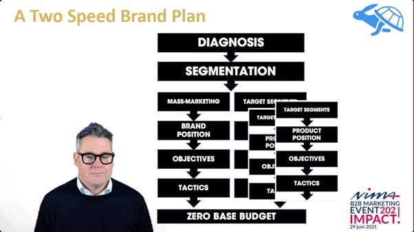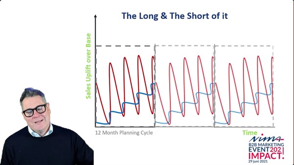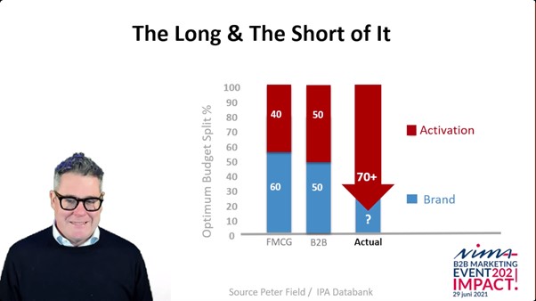 Die ‘overwinning’ was niet geheel terecht geeft Ritson tegenwoordig toe. Uit de duizenden Effie-cases die hij nadien bestudeerde bleek steeds opnieuw dat het effect, dus keiharde omzet of bewijsbare stijging van merkvoorkeur, vrijwel altijd het gevolg bleek van rammen en knallen op tv, of een ander afgeschreven massamedium. Tamelijk ordinair en onpopulair bij veel nieuwe vakgenoten, maar het is niet anders. En er is ook weinig reden te veronderstellen dat dat in B2B anders zou liggen, al wilde Ritson maar zeggen dat het één het ander ook niet uitsluit en je positief kunt bijdragen aan marketingresultaat. In die zin werk je in twee snelheden: de langzame opbouw van een sterk merk naast de snellere activatie in de vorm van scherp geschoten acties. Allemaal wat afhankelijk van je bestaande situatie, maar bottom line sloot Ritson zich behoorlijk aan bij de bevindingen van het LinkedIn-onderzoeksteam onlangs dat stelde dat veel B2B-marketingcommunicatie te weinig oog heeft voor de lange termijn en in veel gevallen tamelijk zinloos is.