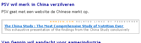 Dat is allemaal aardig, maar wat als in een RSS-feed nauwelijks content wordt meegegeven? Dan wordt het toch wel erg moeilijk om een relevante advertentie te vinden. Dit werd vandaag bevestigd door de RSS-feed van Emerce. Bij een artikel over het betreden van de Chinese markt door PSV, werd een boek aanbevolen dat iedere Emerce-lezer volstrekt koud zou laten: een rapport over de voedingskundige waarde van plantaardige di?ten in rurale Chinese gebieden.