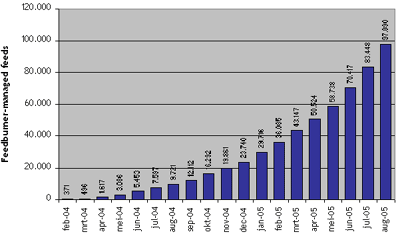 Afgelopen week publiceerde Feedburner de laatste cijfers voor het gebruik van RSS-feeds die via Feedburner worden gemeten. Wereldwijd zijn dit er inmiddels meer dan 100.000. Dit absolute aantal zegt nog weinig over het totale gebruik van RSS. Interessanter is dan ook om naar de trends te kijken van het aantal feeds, de toename van het aantal unieke lezers per feed, het doorklikgedrag en welke RSS-readers er worden gebruikt. Helaas zijn nog niet alle cijfers gepubliceerd maar wellicht komen deze binnenkort.