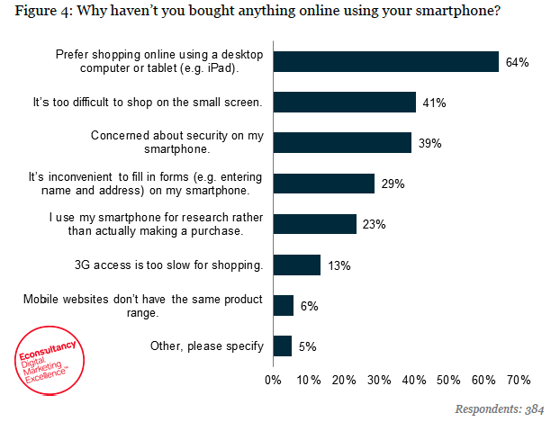 Als onderdeel van het rapport onderzocht Econsultancy waarom consumenten afzien van productaanschaf via de smartphone. Consumenten geven aan dat zij de smartphone vooral gebruiken voor onderzoek en het controleren van prijzen. De uiteindelijke aanschaf doen zij liever met een desktop computer of tablet (64 procent).