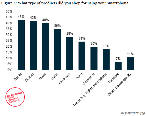 Als we kijken naar wat voor soort producten het meest verkocht worden, zien we dat boeken (43 procent) en kleding (42 procent) bovenaan de lijst staan, op de voet gevolgd door muziek (40 procent) en DVD's (35 procent). Het is wel een beetje de vraag of dit inderdaad een goede weerspiegeling is van het mobiel winkelend publiek of dat het de kracht van Amazon (op mobiel) aantoont. Van de onderzochte productcategorieën is meubilair het minst populair op mobiel (7 procent).