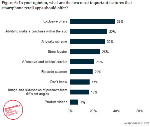 Econsultancy onderzocht ook wat consumenten verwachten van een mobiele winkelapplicatie. Het is kenmerkend voor de huidige staat van mobile commerce dat de mogelijkheid tot het 'in-app' aankopen door 32 procent van de respondenten wordt genoemd. Exclusieve aanbiedingen (38 procent) prijkt bovenaan de lijst. Een loyaliteitsprogramma (30 procent) en een store locator (26 procent) worden ook vaak genoemd.