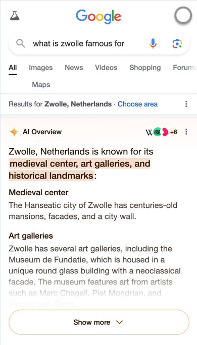 - ‘Zero click’-zoekresultaten: Google toont al een aantal jaar het antwoord op een zoekvraag zelf in de zoekresultaten, waardoor je voor bijvoorbeeld het weer niet meer naar een andere website hoeft door te klikken.