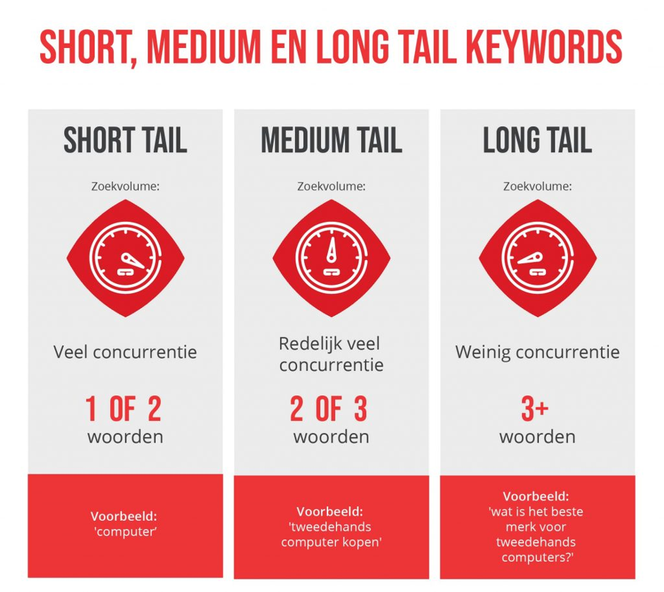 SEO heeft een staartje. Drie zelfs: short tail, mid tail en long tail keywords. (Of als je, net als ik, van ‘den ouderwetschen Nederlanschen taal’ houdt: korte zoekwoorden, middellange zoekwoorden en lange zoekwoorden.)