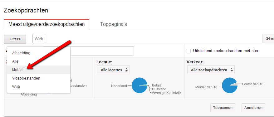 Selecteer mobiel en zie hoeveel en welke zoekopdrachten er in Google op de mobiel gedaan zijn en tot hoeveel klikken naar de website dit heeft geleid.