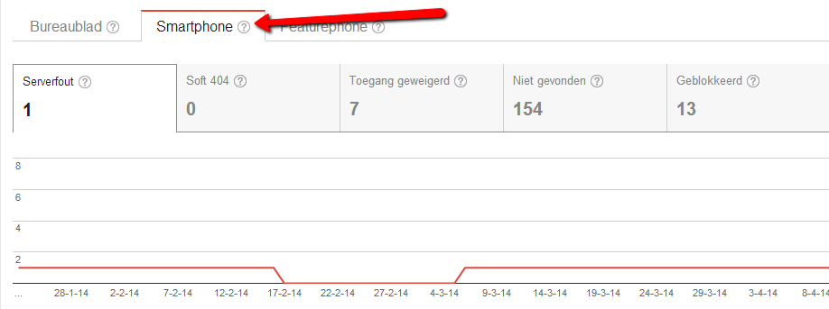 Selecteer smartphone en zie bijvoorbeeld welke pagina’s er een 404 opleveren en welke pagina’s er geblokkeerd worden voor Googlebot.