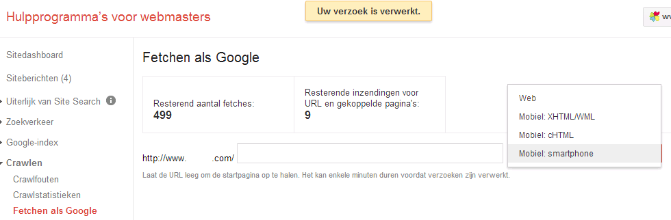 Fetchen als Google is een manier om te bekijken wat Googlebot daadwerkelijk aan elementen op de pagina ziet. Als je “Mobiel: smartphone” selecteert, zie je die.