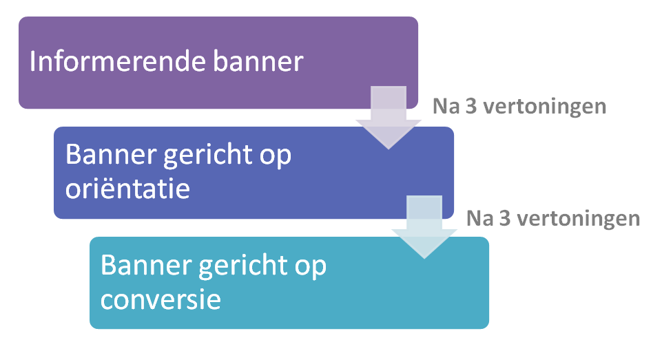 Je kan verschillende combinaties maken van uitingen en die in een bepaalde volgorde aan de gebruiker laten zien. Laat bijvoorbeeld eerst drie keer een banner zien die inspeelt op de informatie behoefte, om vervolgens een aanbod te laten zien dat gericht is op conversie. Mocht de gebruiker nog niet reageren, kun je proberen de gebruiker over te halen met een banner met daarin een extra incentive. Mocht dit alles er niet toe leiden dat een gebruiker klikt of converteert, kun je vervolgens een ander product laten zien waar de gebruiker mogelijk wel in is geïnteresseerd.