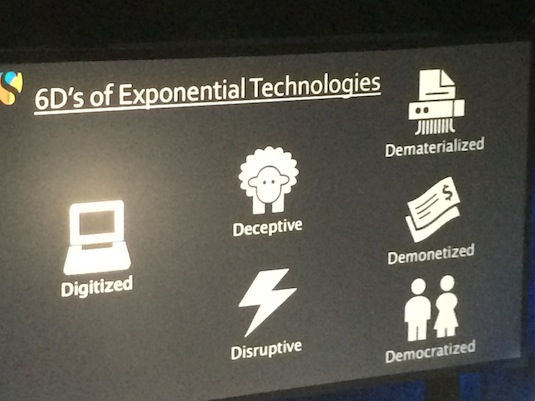De platmakers uit Friedman’s boek ‘The World Is Flat’ komen versterkt terug op de SU. Die krachten zorgen ervoor dat kennis, informatie, tools en kansen toegankelijk worden voor een steeds grotere hoeveelheid mensen. En worden versterkt door deze 6 D’s van het singularity-gedachtegoed: dematerialized, digitized, deceptive, demonetized, disruptive, democratized.