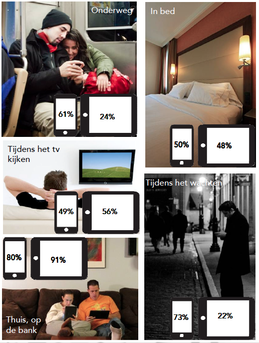 Van de tablet is het wel bekend dat het een apparaat is wat grotendeels thuis wordt gebracht. Het onderzoek van Ruigrok laat zien dat ook het gebruik van de smartphone thuis groter is dan buitenshuis. Zowel de smartphone als de tablet worden veel gebruikt voor het opzoeken van informatie en voor het lezen van nieuws. Voor het bekijken van foto’s of video’s en het oriënteren op de aankoop van producten is de tablet meer in trek. Het blijkt dat vrouwen vaker informatie zoeken op hun tablet, terwijl mannen hier hun smartphone voor gebruiken. Ook blijkt dat een kwart de smartphone en bijna de helft de tablet gebruikt voor het spelen van spelletjes. Opvallend hierin is dat dit vaker vrouwen dan mannen zijn.