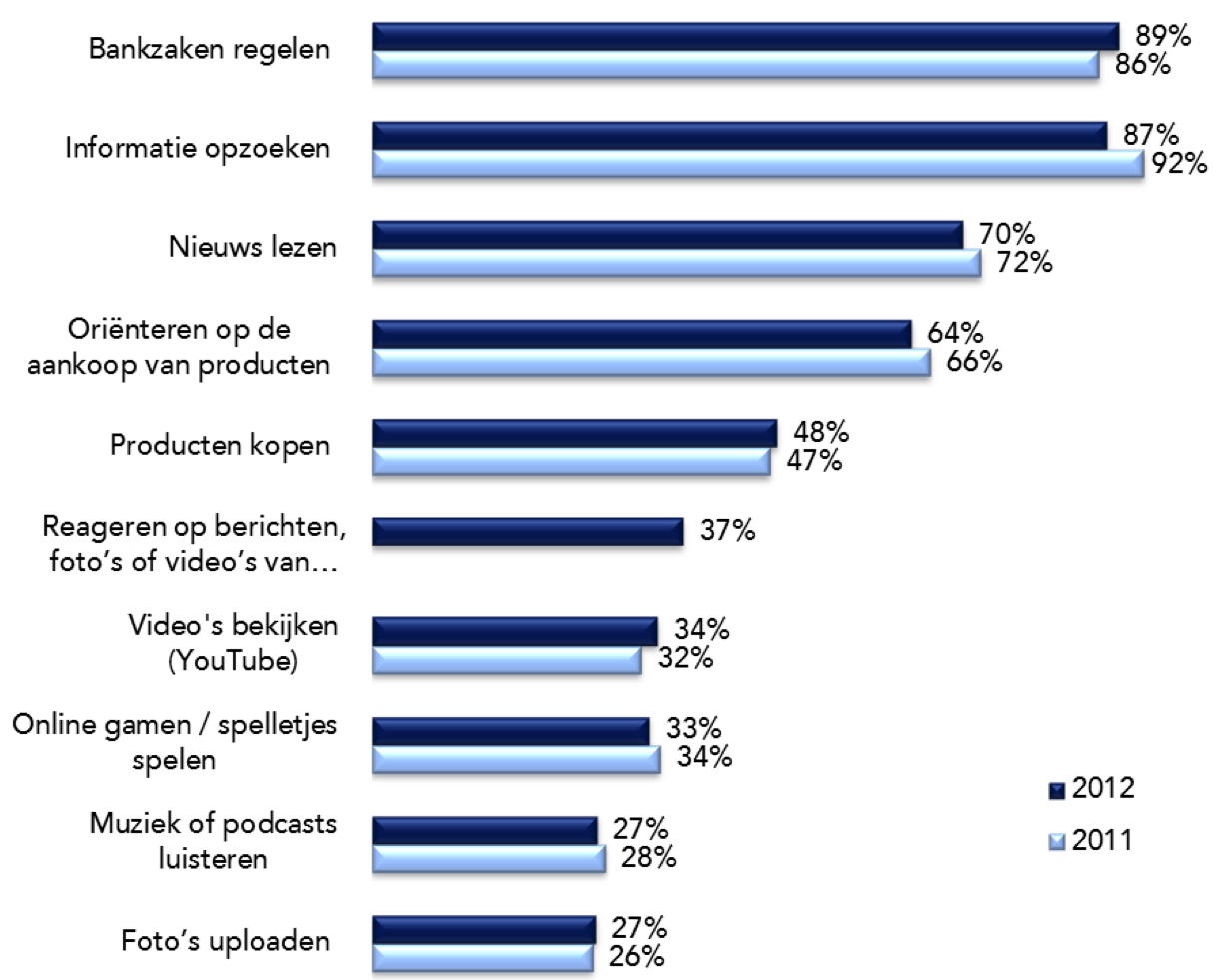 Het internet is niet meer weg te denken uit de hedendaagse samenleving. Weerbericht? Online. Vakantiefoto’s van vrienden bekijken. Online! Het regelen van de bankzaken staat op nummer 1 qua online activiteiten, zowel bij jongeren als ouderen. Daarnaast wordt het internet 'natuurlijk' enorm veel gebruikt om informatie op te zoeken. Wel zien we hier enorme verschillen tussen hoger opgeleiden (72%) en lager opgeleiden (44%).