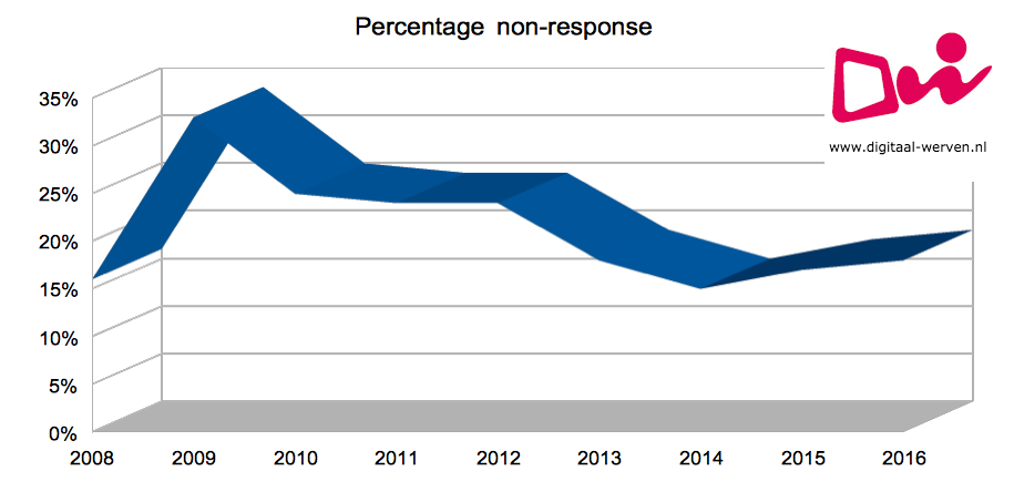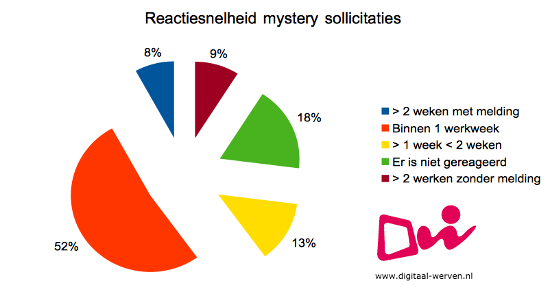 Digitaal-Werven onderzoekt al jaren de digitale sollicitatie-ervaring bij de 500 grotere en bekendere organisaties van Nederland. Onderdeel van het onderzoek is de mystery-sollicitatie. Dit jaar bedraagt het aantal onbeantwoorde sollicitaties 18 procent. Dus bij 18 van de 100 grotere en bekendere organisaties van Nederland hebben we na een (gerichte) sollicitatie niets meer gehoord. Dit percentage is al jaren redelijk stabiel.