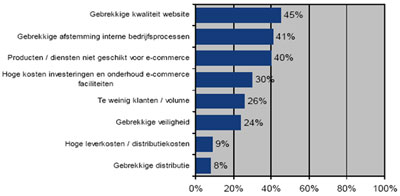 Eerder deze week lazen we op marketingonline.nl dat de e-commerce activiteiten bij Nederlandse ondernemingen nog niet succesvol zijn. De drie belangrijkste valkuilen bij de implementatie van e-commerce zijn volgens de ondervraagde ondernemers een gebrekkige kwaliteit van de website (45 procent), een gebrekkige afstemming van de interne bedrijfsprocessen (41 procent) en het feit dat de producten of diensten niet geschikt zijn voor e-commerce (40 procent). Deze resultaten zijn afkomstig uit de meest recente ICT Barometer van Ernst & Young (pdf).