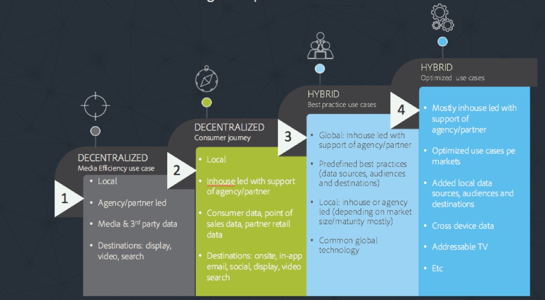 Naast het informeren en activeren van de interne stakeholders is het van belang om een groeistrategie te ontwikkelen voor het gebruik van een DMP. Voor de meeste internationale organisaties geldt dat het raadzaam is om klein te beginnen. Een decentrale aanpak gericht op het verhogen van de efficiency van advertising, meestal onder leiding van een bureau, ligt hierbij voor de hand. Hierbij wordt vooral gebruikgemaakt van third-party data, op basis waarvan vervolgens geautomatiseerde optimalisatie van display, video en search campagnes mogelijk wordt.