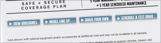 Het is slim om in de footer wat plek in te ruimen van het stimuleren van gewenste acties. Bijvoorbeeld het downloaden van een whitepaper of het bekijken van de nieuwste producten. In de autobranche is dit vaak het aanvragen van een proefrit of brochure. Allemaal acties die een volgende stap in een aankoopproces stimuleren.