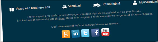 De footer van Suzuki is deels actiegericht. De social links zijn ook erg prominent aanwezig.