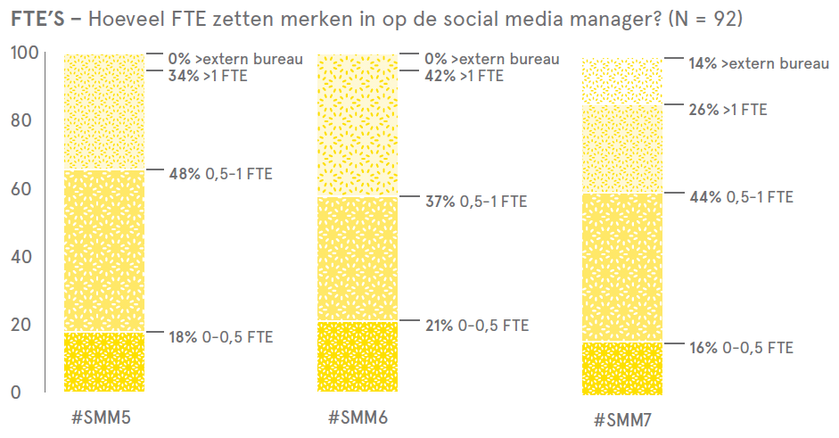 - Rol van socialmediamanager vaker uitbesteed. In vergelijking met vorig jaar is opvallend dat de rol van socialmediamanager in 14 procent van de gevallen is uitbesteed, tegen 0 (nul) procent vorig jaar. Tegelijkertijd zijn er meer bedrijven die 0,5 tot 1 FTE hebben vrijgemaakt voor die rol (44 procent dit jaar tegen 37 procent vorig jaar), terwijl het aandeel van bedrijven met meer dan 1 FTE terugliep (26 vs. 42 procent). Daarmee lijkt de rol meer coördinerend en minder uitvoerend te worden.