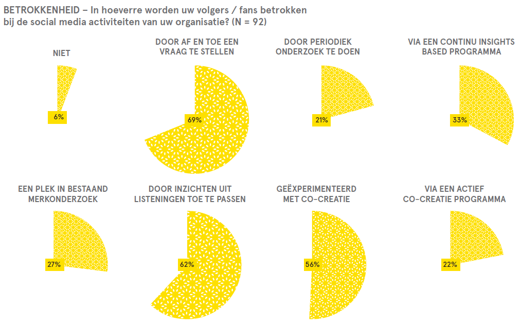 - Social insights on(der)benut. Voortbordurend op bovenstaande punt: slechts 22 procent van de merken betrekt consumenten voortdurend bij productontwikkeling – terwijl de helft wel eens met co-creatie heeft gewerkt – en slechts eenderde doet continue insights op vanuit een gerichte contentstrategie.