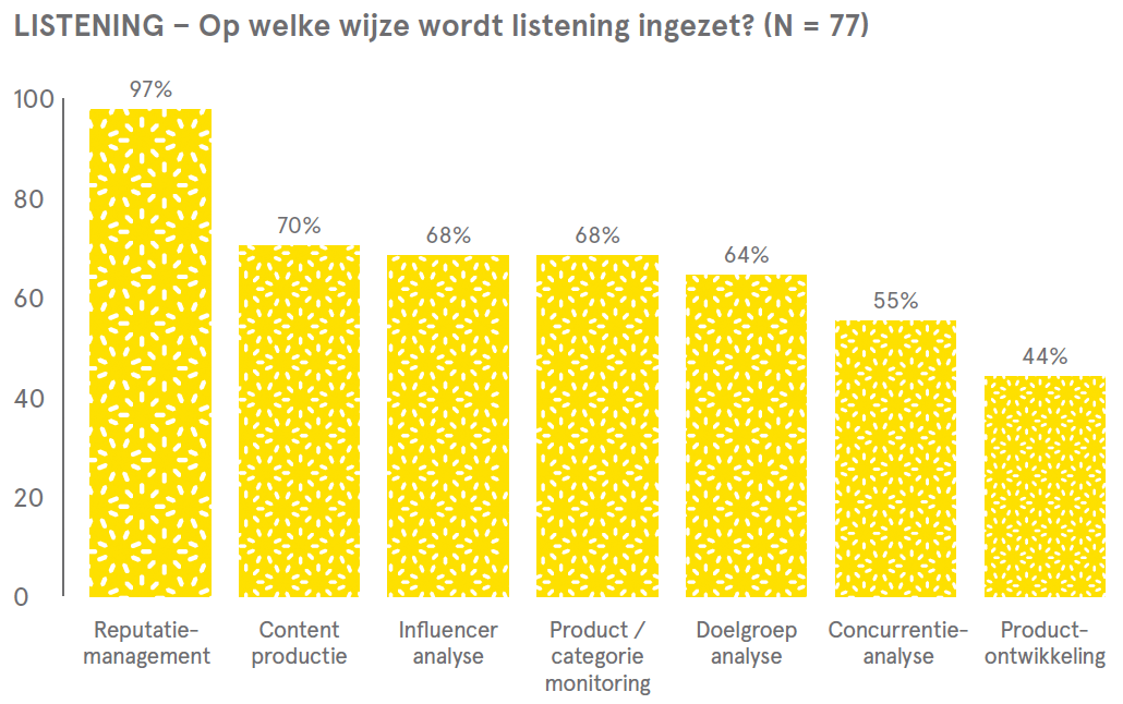 - Social listening belangrijker. Het willen inspelen op actualiteiten maakt het monitoren ervan noodzakelijk. Vandaar dat veel merken (86 procent) social listening inzetten en zelfs gebruiken voor de eigen contentproductie (70 procent). Minder dan de helft van de ‘social listeners’ zet de verworven inzichten ook in voor bijvoorbeeld een beter begrip van consumenten of voor productontwikkeling.