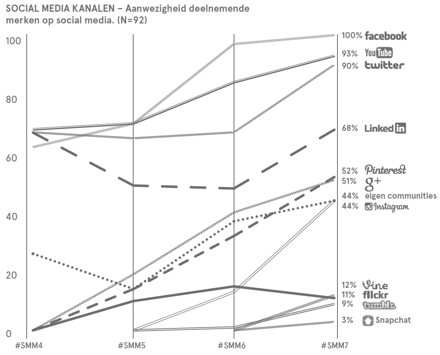 - Merken zijn aanwezig op steeds meer platforms. De socialmedia-activiteiten op sommige platforms, zoals Facebook, worden eenvoudiger, omdat ze steeds meer de vorm van advertising aannemen – voor veel merken bekend terrein. Daarnaast worden steeds meer andere platforms ingezet om de social presence te verbreden en klanten te kunnen bereiken.