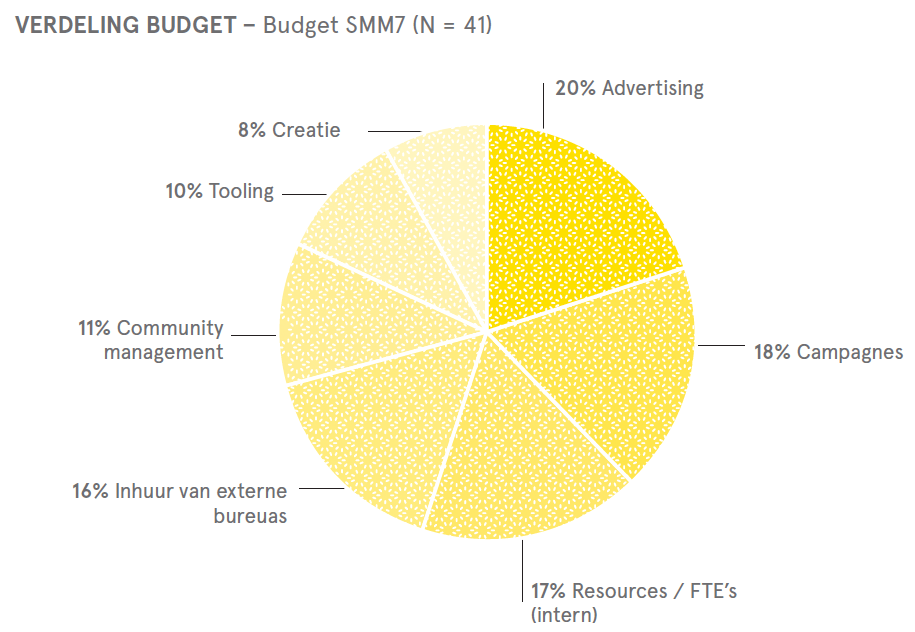- Budgetten zijn nagenoeg onveranderd. Ten opzichte van SMM6 is er op budgettair gebied niet zo veel veranderd. Eenderde van de bedrijven geeft tot 200.000 euro uit. Tegelijkertijd heeft 6 procent van de merken meer dan 6 ton te besteden, tegen 9 procent die geen apart budget beschikbaar hebben. Voor komend jaar verwacht de meerderheid dat het budget gelijk blijft of licht stijgt.