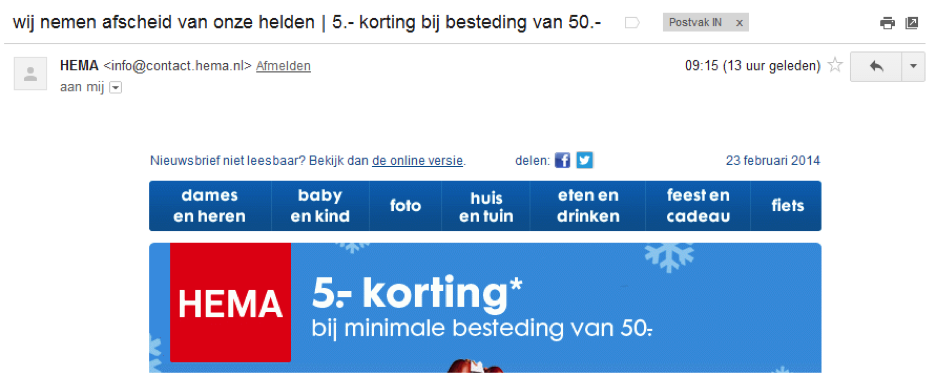 Consumenten met een Gmail-adres hoeven dus niet langer te zoeken naar de vaak zo ‘verstopte’ afmeldlink om vervolgens op een landingspage je af te melden. Vanaf nu wordt naast de afzender de kans geboden zich af te melden. Na een klik op ‘Afmelden’ hoef je je keuze alleen nog maar te bevestigen. Het is daarmee dus niet langer nodig om eerst de website van de afzender te bezoeken en je daar vervolgens af te melden. De afmeldlink wordt in de HTML opgepakt uit de ‘list unsubscribe’ in de header – dat kan zowel een mailto-command als een webadres zijn. Je campagneplatform, bijvoorbeeld Tripolis Dialogue of Selligent, vangen de afmelding af.