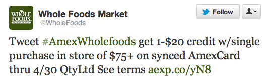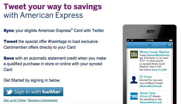 American Express biedt sinds enige tijd aan haar Amerikaanse kaarthouders de mogelijkheid om via logins op Foursquare of het geven van een like op Facebook speciale aanbiedingen te verkrijgen. Sinds gisteren is daar Twitter aan toegevoegd. AmEx-klanten die speciale aanbiedingen inclusief de hashtag twitteren, komen direct via hun account in aanmerking voor de aanbieding. De ultieme social campagne of toch niet?