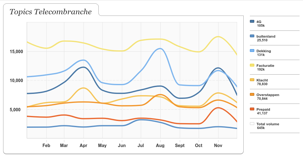 Een klant praat veel vaker over branchegerelateerde onderwerpen, dan direct over merken. Simpel gezegd: als je als brandmanager van Tele2 wilt weten wat mensen over de iPhone SE zeggen, beperkt diens monitoring zich vaak tot alles wat over Tele2 of iPhone SE gezegd wordt (let op: het is een hypothetisch voorbeeld). Hierdoor mis je het voortraject van mensen voorafgaand aan die keuze.