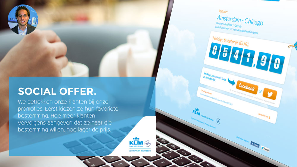 Maar levert het ook geld op, al dat aardige gedoe op socials? Jazeker, door slimme apps te ontwikkelen die administratieve rompslomp omzeilen. Door een populaire bestemming te veilen en vervolgens alle deelnemers het lage tarief aan te bieden. En door lege vliegtuigen te vullen door getargete posts in de doelgroep. Maak sales dus social by design.