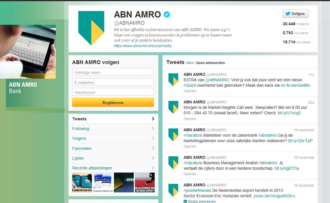 In het contact met klanten spelen social media voor ABN AMRO een steeds belangrijker rol. Vanuit het Advies en Service Center (ASC) is een groep speciaal opgeleide adviseurs 24/7 beschikbaar voor conversaties via een aantal sociale platformen. Waar het accent nu nog grotendeels ligt op het reageren op relevante klantsignalen, zal de dialoog met (potentiële) klanten in de nabije toekomst steeds pro-actiever worden aangegaan, in alle fasen van het koopproces.