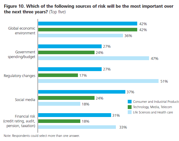 Sociale media zijn een groot risico. Dat is een van de resultaten van het “Aftershock: Adjusting to the New World of Risk Management” onderzoek. Forbes Insights heeft in samenwerking met Deloitte onderzoek gedaan onder 192 Amerikaanse executives uit diverse sectoren omtrent risicomanagement. Het betreffen executives van organisaties die een omzet hebben van minimaal één miljard dollar. De respondenten zagen sociale media als de vier na grootste bron van risico, mede door hun vermogen om als 'versnellers' van andere risico’s te fungeren.