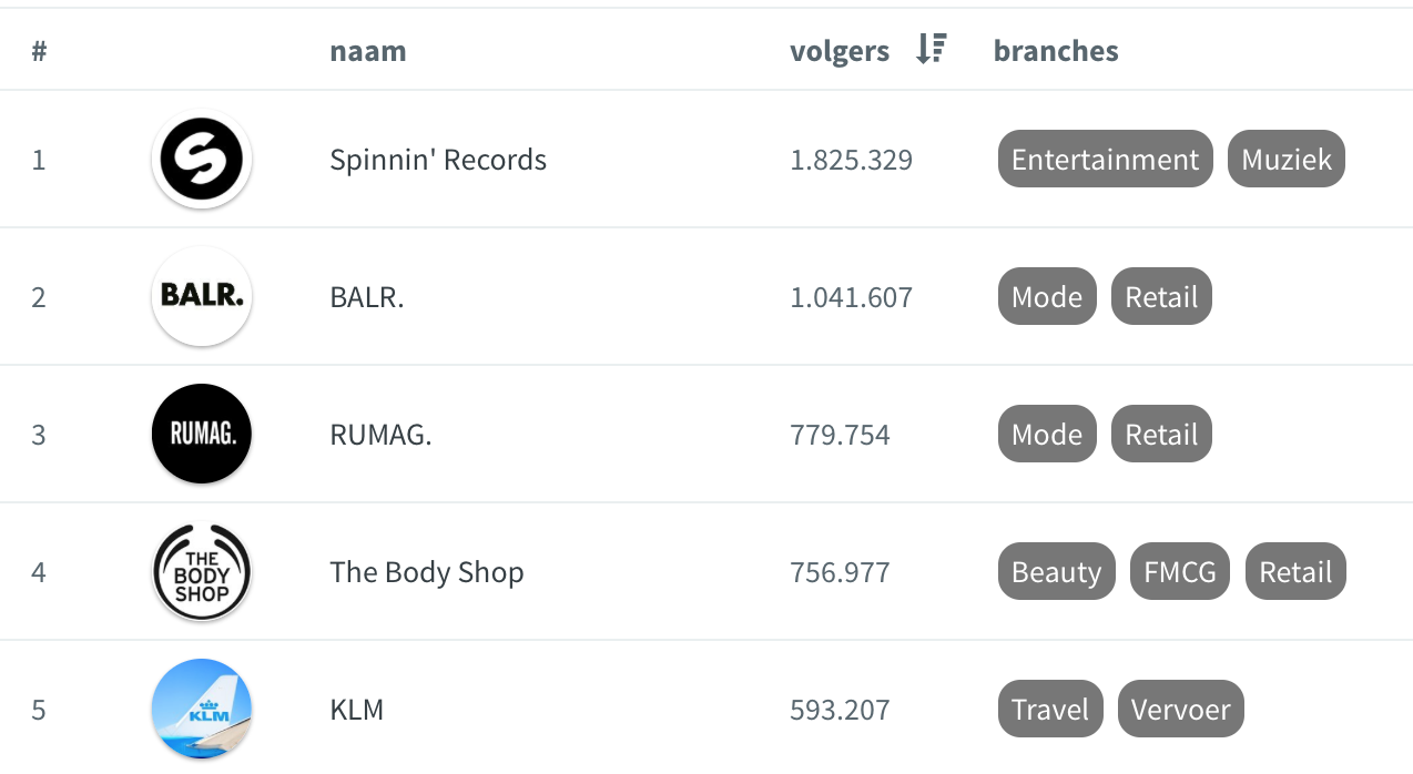 Het Instagramaccount van Spinnin’ Records is het grootste merk van Nederlandse bodem op Instagram, gevolgd door BALR. en Rumag. In de lijst van grootste Nederlandse Instagram-accounts zijn veel mode- en beautymerken terug te vinden. De meest interactieve Nederlandse merken op Instagram zijn op het moment van schrijven National Geographic Junior (IPM 123,3), Hummel (IPM 114,1) en de Apenheul (IPM 102,8).