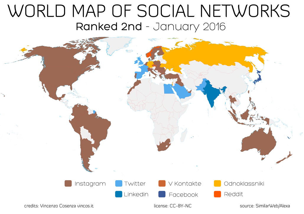 Facebook is met 1,79 miljard maandelijkse actieve gebruikers met afstand het meest gebruikte sociale netwerk ter wereld. Van die 1,79 miljard zijn er 1,18 miljard dagelijks actief. Facebook is nu in 129 van de 137 door Vincenzo Cosenza onderzochte landen het meest gebruikte sociale netwerk. In onderstaande grafiek is te zien dat Rusland en China de grote gaten zijn in de wereldkaart van Facebook. Japan is het enige land waar Twitter het grootste sociale netwerk is. Het heeft daar 35 miljoen actieve gebruikers, Facebook 25 miljoen.