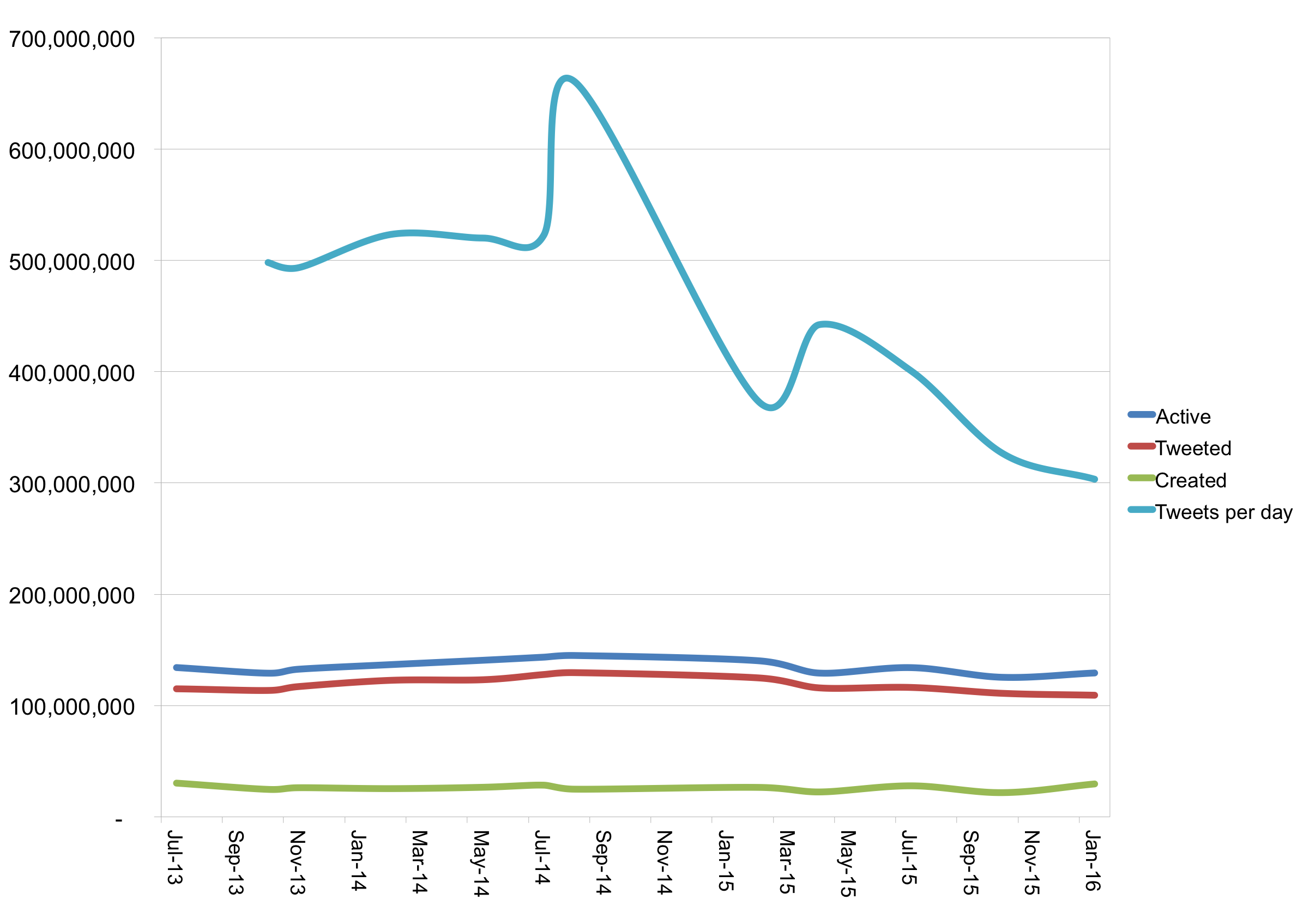 Twittergebruikers versturen samen 500 miljoen tweets per dag, maar dat cijfer dateert van augustus 2014. Volgens een ontwikkelaar die data van de Twitter API heeft verkregen, is dit aantal inmiddels sterk teruggelopen (zie onderstaande grafiek). Zoals Business Insider zelf ook al stelt, is het sterk de vraag hoe accuraat deze data zijn. Het feit dat Twitter strenger is geworden op het uitgeven van dit soort data (data die niet noodzakelijk is voor gebruikersacties) en het succesvol terugbrengen van spammers en bots vertroebelen het beeld.