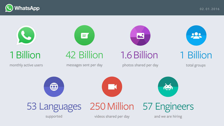 WhatsApp is niet heel scheutig met het publiceren van cijfers. Het meest recente cijfer dateert van februari 2016: 1 miljard maandelijks actieve gebruikers. Volgens oprichter Jan Koum worden er dagelijks meer dan 42 miljard berichten verstuurd via het instant messaging platform. Bovendien worden dagelijks 1,6 miljard foto’s en 250 miljoen video’s gedeeld.