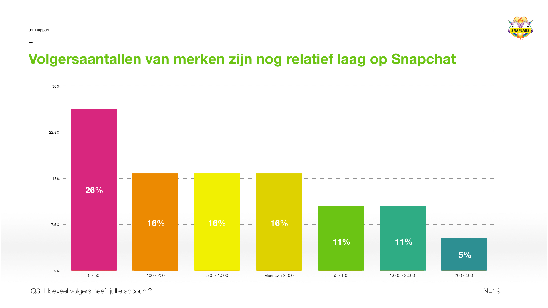 Al die indrukwekkende aantallen trekken in toenemende mate bedrijven aan. Uit onderzoek van Marketingfacts en Social Embassy naar de inzet van SnapChat door merken blijkt dat de volgersaantallen nog laag zijn. Een kwart van de merken zit nog onder de vijftig volgers, 58 procent zit onder de 500 volgers.