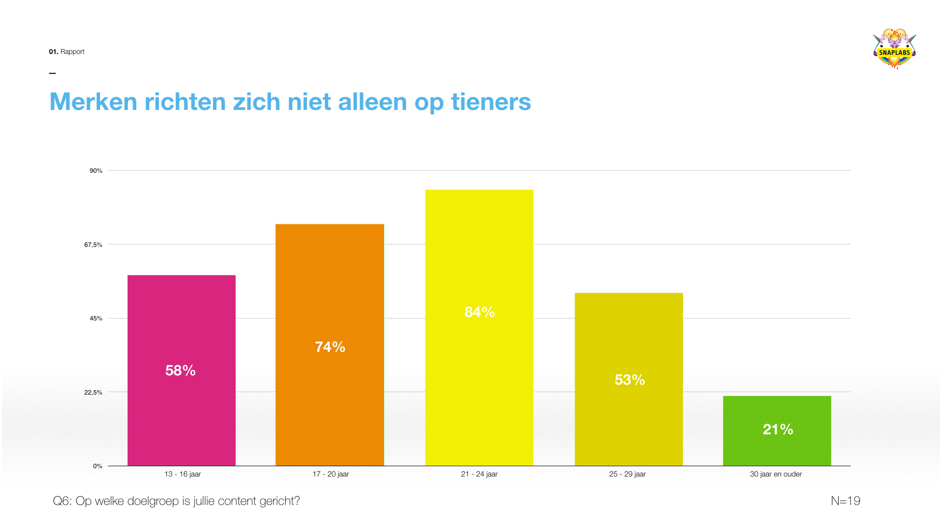 Er zijn in Nederland 1 miljoen mensen die zeggen Snapchat te gebruiken, waarvan 541.000 dagelijks. Snapchat is gebombardeerd tot het jongerenplatform bij uitstek. Ouders lezen en kijken immers eerder op Facebook mee dan op Snapchat. Het hangt ervan af hoe je ‘jongeren’ definieert, maar merken richten zich niet alleen op tieners. Eigenlijk geldt: als je maar onder de dertig bent, val je binnen de doelgroep die merken willen bereiken via Snapchat.
