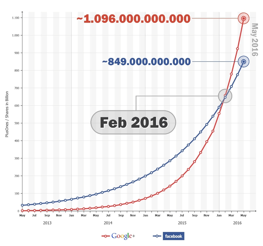 Zou je deze trend volgen, dan zou het aantal Google+-shares die van Facebook in 2016 overschrijden. Dat is echter niet helemaal waar. Het onderzoek vergelijkt namelijk twee verschillende dingen: +1 kliks op Google+ versus “shares” op Facebook. Een meer solide vergelijking zou natuurlijk zijn door Facebook “likes” te vergelijken met +1 kliks, of Facebook “shares” met Google+ shares/posts.