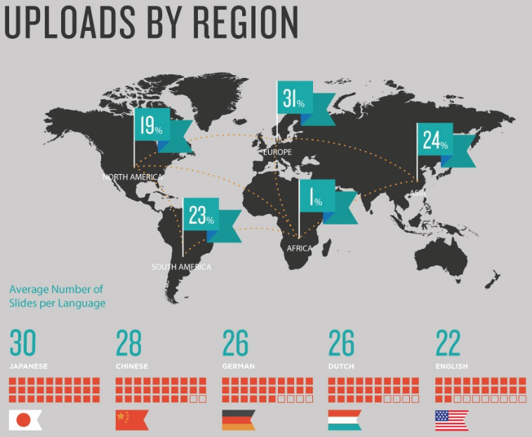 In mei dit jaar maakte SlideShare bekend dat er meer dan 10 miljoen presentaties zijn geüpload naar het platform. 31 procent van de presentaties op SlideShare komt van Europese gebruikers, daarmee is Europa het grootste continent op SlideShare. Fun fact: Nederlanders gebruiken gemiddeld 26 slides in hun presentaties.