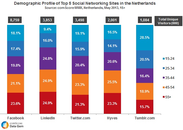 In juni publiceerde comScore data over de profielen van de gebruikers. Uit die data blijkt dat Hyves een relatief groot aandeel ouderen heeft. Tweederde van hun gebruikers is ouder dan 35 (69,4 procent). Bij Tumblr is iets meer dan de helft (51 procent) van de gebruikers ouder dan 35. Het aantal bezoekers in de leeftijd van 45 tot en met 54 is het grootste segment voor zowel Twitter als LinkedIn. Bij Facebook is de grootste groep bezoekers die van 55 jaar en ouder.