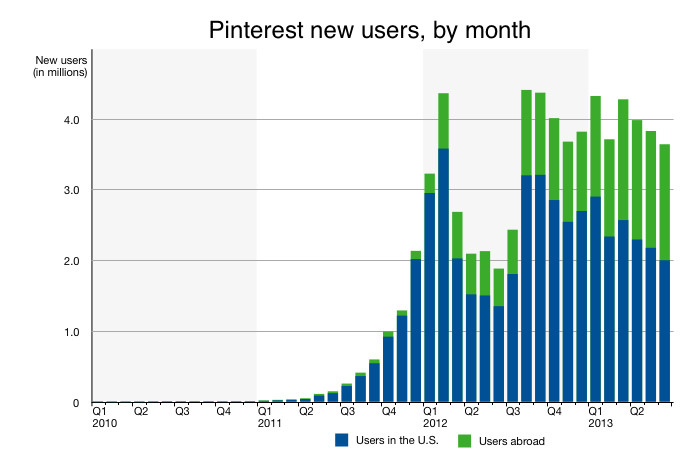 Uit onderzoek van Semiocast blijkt dat Pinterest meer dan 70 miljoen gebruikers heeft. Voor het onderzoek analyseerde Semiocast 70 miljoen Pinterest-profielen. Daaruit is onderstaande grafiek van de groei van Pinterest gekomen: