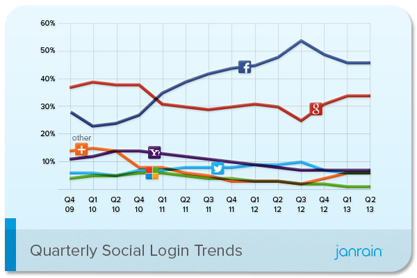 Google+ wordt daarnaast steeds populairder voor social logins. Uit onderzoek van Janrain (DAT tools maakt om socialnetworklogins te implementeren) blijkt dat Google+ na Facebook het meest gebruikt wordt voor social logins.