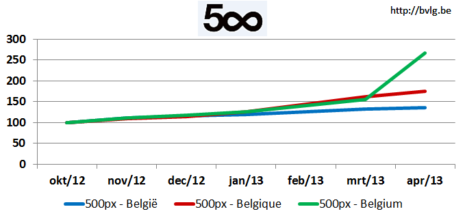 Door het vermeende gebrek van visie bij Flickr door het Yahoo-management hebben een aantal Flickr-gebruikers de overstap gemaakt naar 500px. Die site biedt gelukkig ook info aan over het aantal foto's voor zoektermen. De cijfers tonen aan dat 500px duidelijk nog het (zeer) kleine broertje blijft naast Picasa en Flickr.