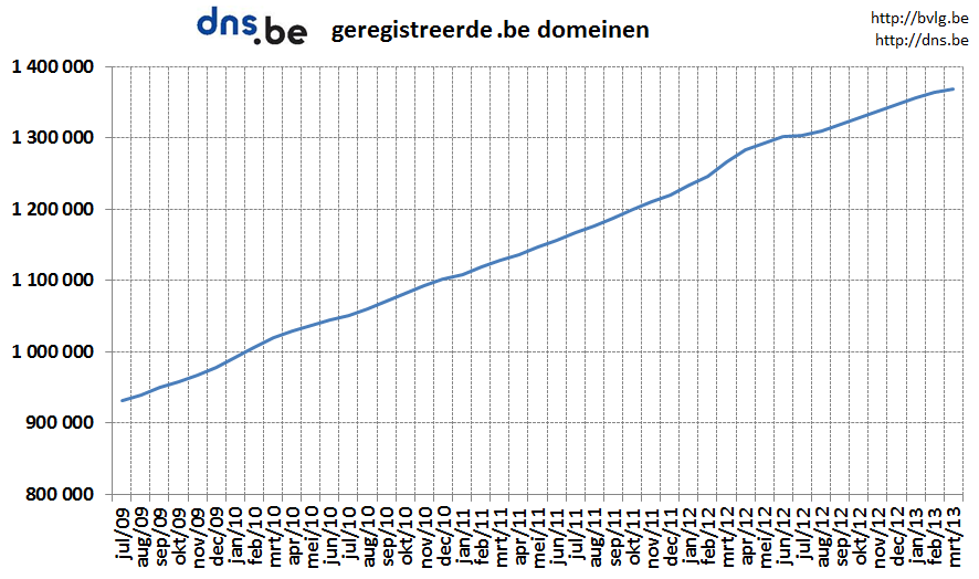dns.be stelt op haar website informatie ter beschikking over het aantal geregistreerde .be domeinen. Sinds een tijdje worden deze cijfers hier ook overgenomen, als vergelijkingspunt met de informatie over de sociaalnetwerksites. Voor maart 2013 waren er 1.368.635 geregistreerde .be domeinen, een stijging van 1% ten opzichte van vorige maand, een stijging van 8% ten opzichte van vorig jaar. De groei op jaarbasis lijkt lichtjes te vertragen, enkele maanden terug bedroeg deze nog meer dan 10%.
