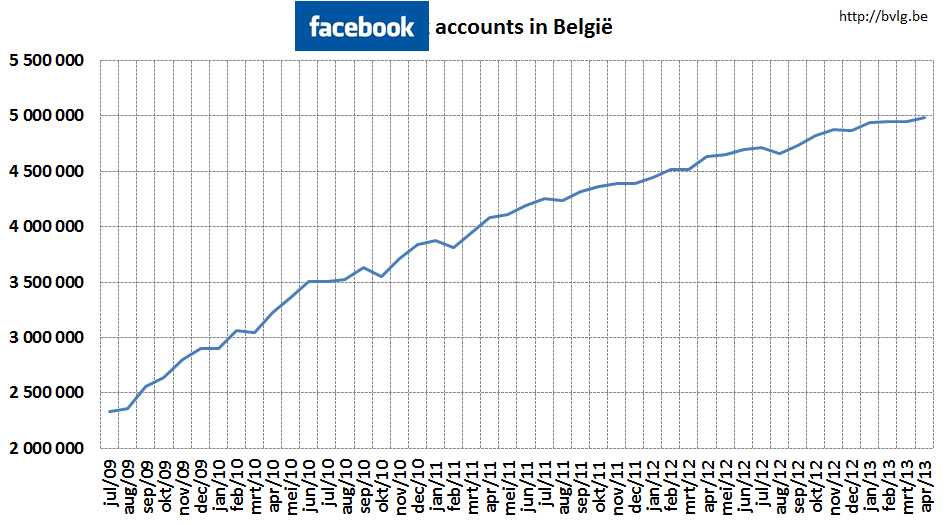 Volgens Socialbakers staat België op de 37ste plaats op de wereldranglijst wat betreft Facebook Accounts. België staat achter Marokko en wordt gevolgd door Zweden. De evolutie van het aantal Belgische Facebook accounts over de voorbije maanden wordt hieronder weergegeven. Sinds het najaar van 2011 is de groei significant aan het dalen.
