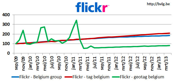 Deze cijfers geven op zichzelf niet aan hoeveel personen uit België Flickr gebruiken. Door dezelfde zoekopdrachten telkens te herhalen, zijn ze wel indicatoren van de groei van het gebruik van Flickr in België. De opgevolgde indicatoren geven sinds april 2011 een stabiele evolutie aan. In december was er heel wat te doen rond de nieuwe gebruiksvoorwaarden van Instagram, wat sommige er toe bracht opnieuw over te stappen naar Flickr, althans naar eigen zeggen. In de bovenstaande cijfers is dit echter nog niet terug te vinden.