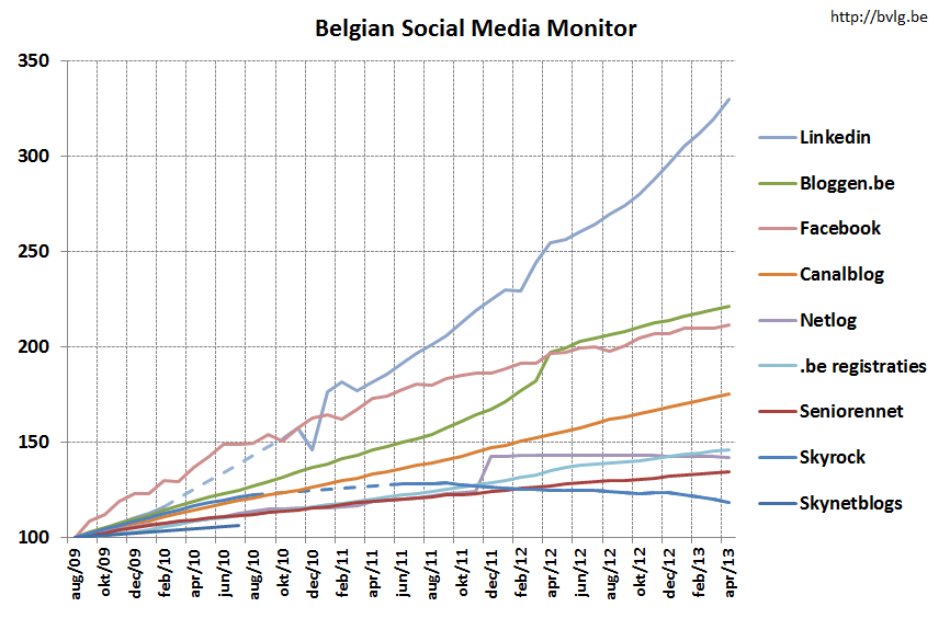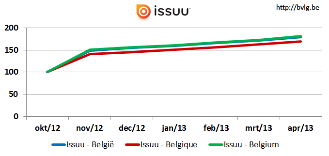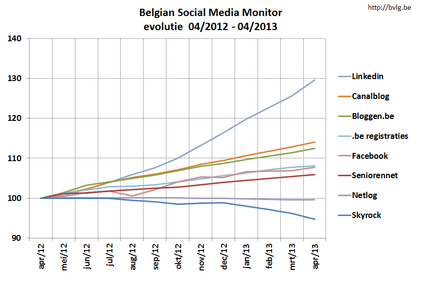 De situatie van begin april 2013 wordt voor zover mogelijk vergeleken met de situatie van vorige maand (maart 2013) en van vorig jaar (april 2012). De onderstaande grafiek geeft alvast de evolutie van enkele platformen over de voorbije 12 maanden, van april 2012 tot april 2013.