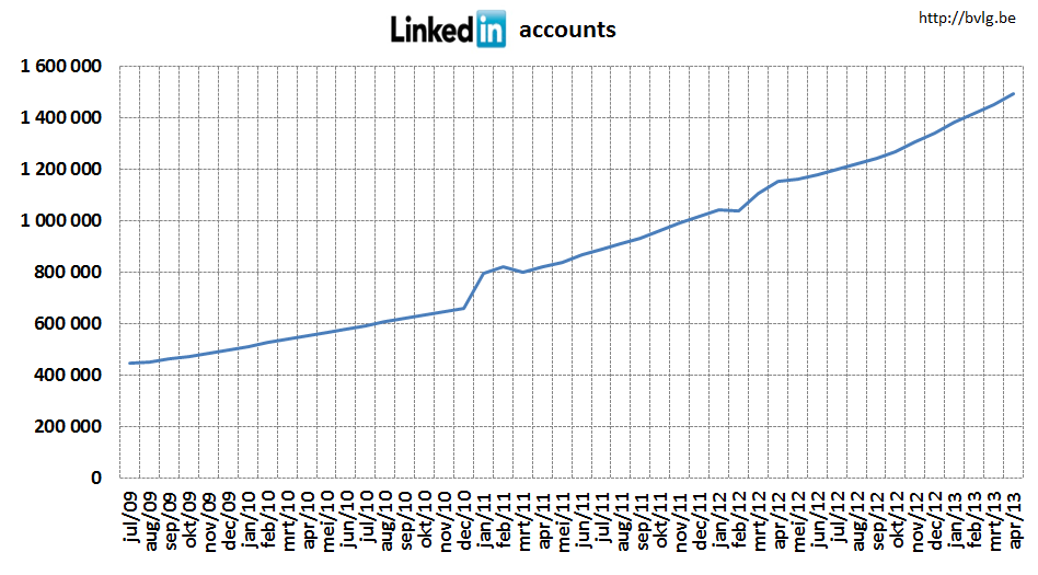 En hier volgt de gedetailleerde grafiek van het aantal LinkedIn profielen in België. De groei lijkt mooi door te zetten.