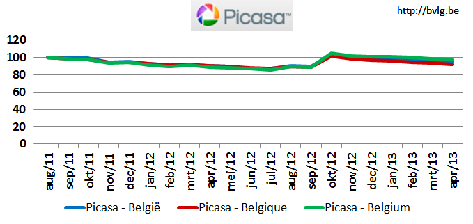 Deze cijfers geven niet het totaal aantal foto's in Picasa, enkel de foto's die publiek zijn. Bizar is dat het aantal foto's zo goed als elke maand daalt en niet toeneemt zoals bij andere foto-sites.